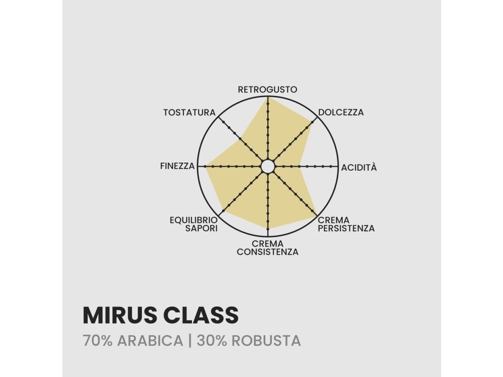 Má zreteľnú sladkosť, ktorá sa zvyšuje s každým dúškom a po dopití zostáva na konci jazyka. Mirus class je ideálna na prípravu espressa s bohatou penou, cappuccina a latte.
